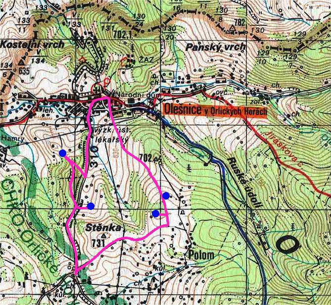 okružní naučná stezka, začátek a konec na náměstí v Olešnici v O.h.